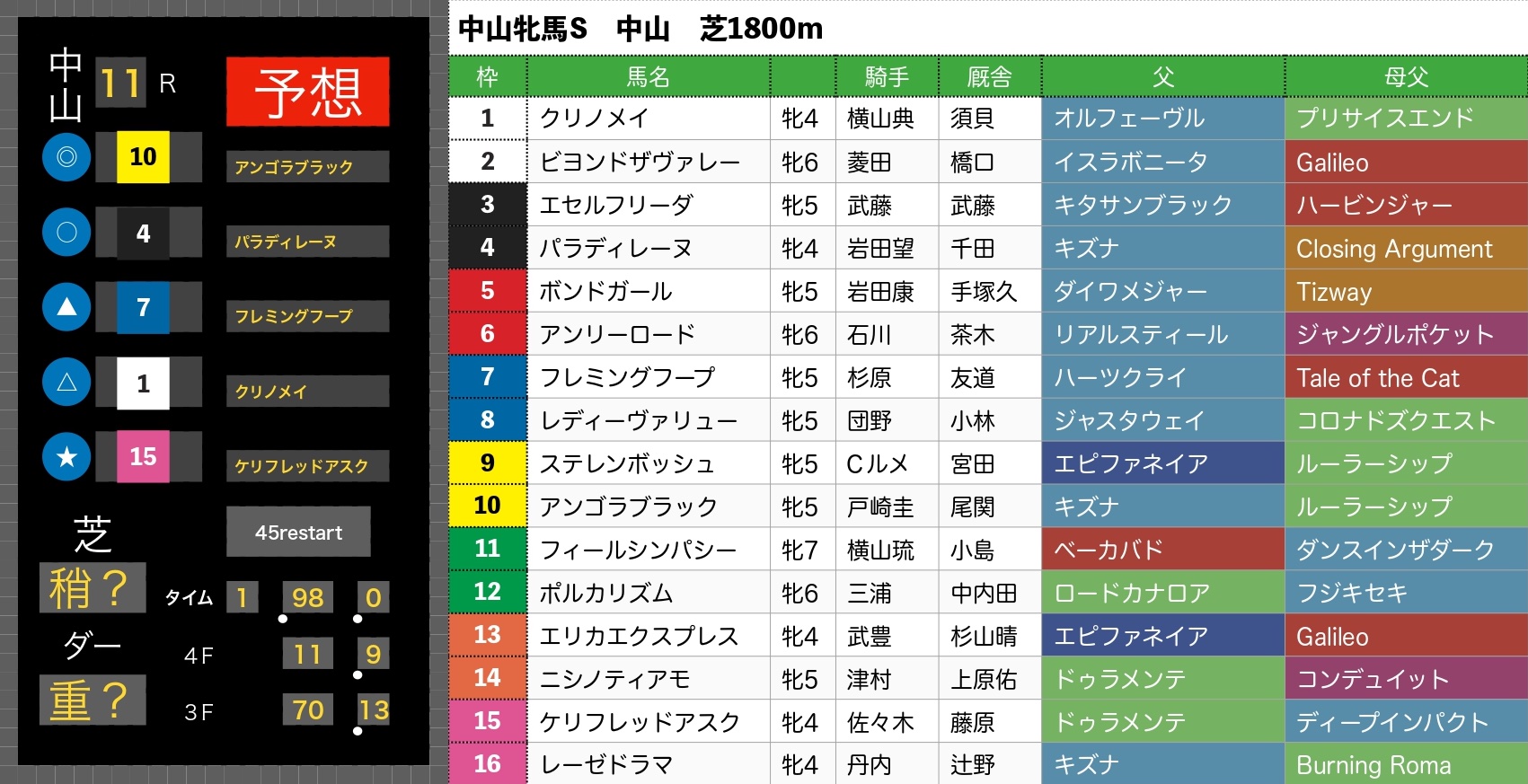 - 本命の10(アンゴラブラック)に託したのは「キズナ産駒」であり、母父に「ルーラーシップ」を持つという、このレースの傾向(キングマンボ系、持続力)に完璧に合致する血統構成。加えて戸崎騎手が鞍上という点も、過去の好走データから見て「鉄板」の安心感。